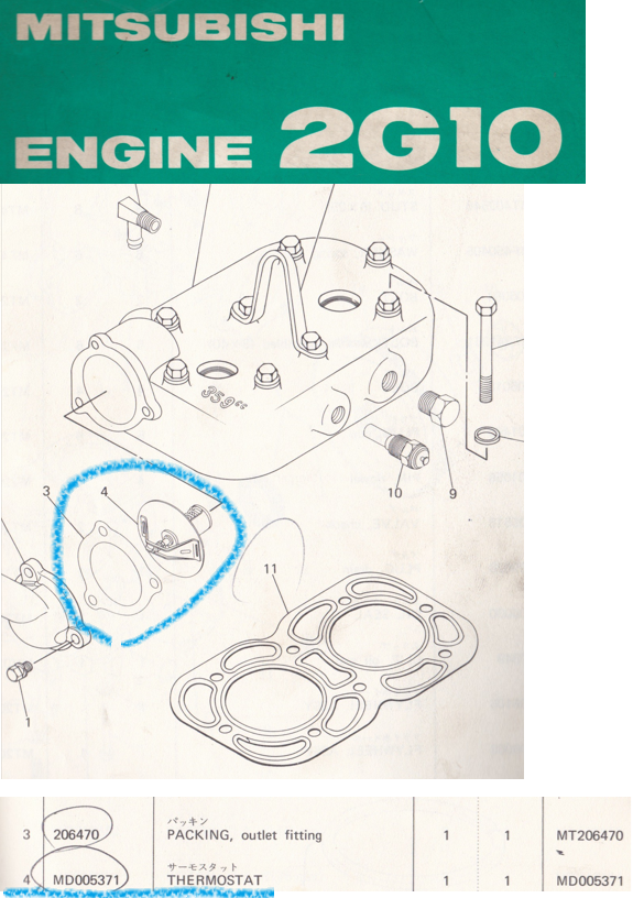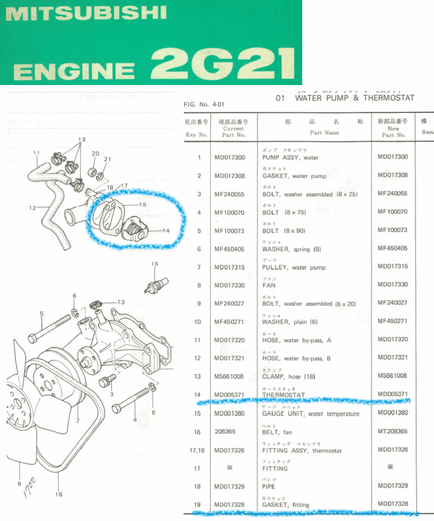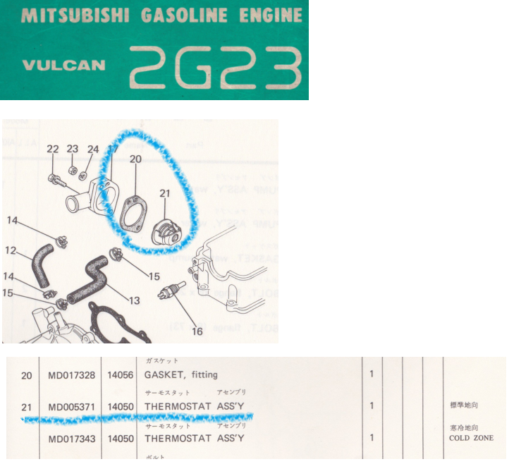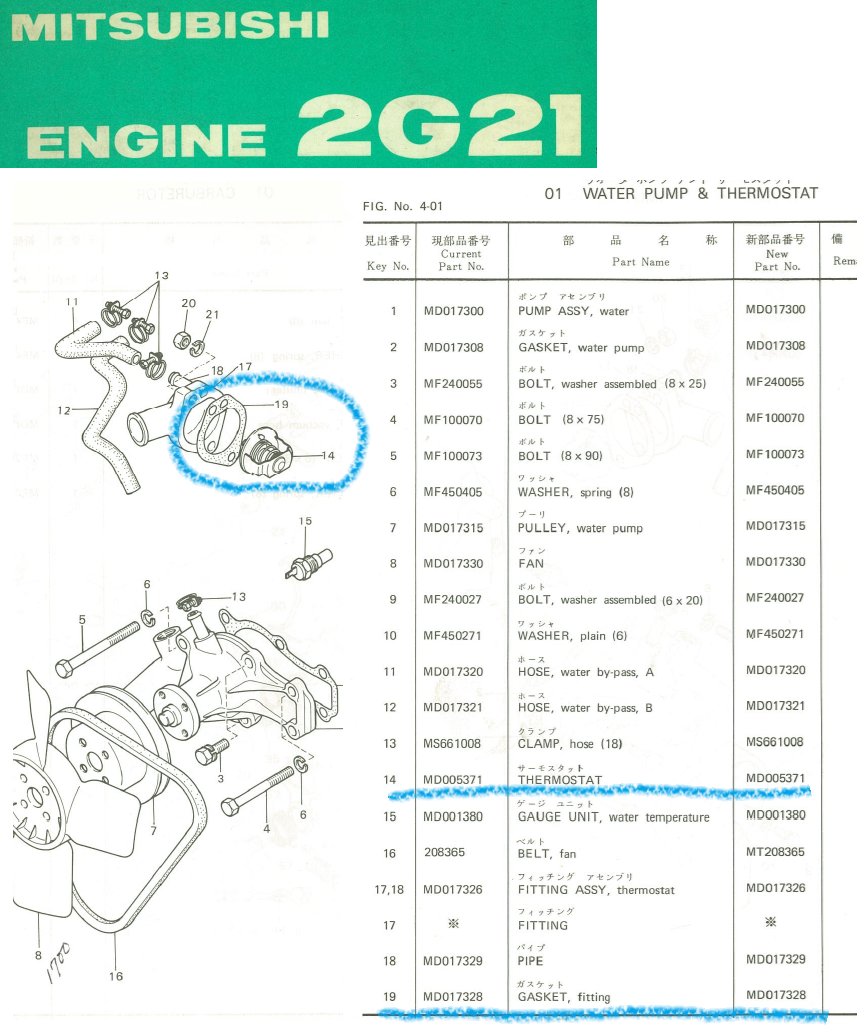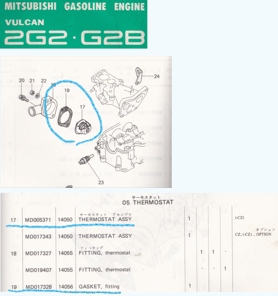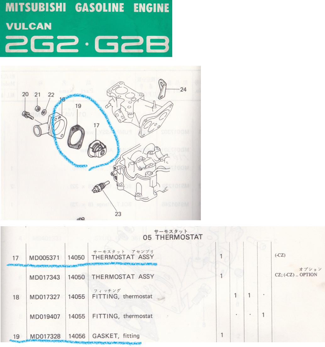 サーモスタットは、初期の水冷エンジン2G10から550ccのG23Bまで「MD005371」になっています。一方、ガスケット(パッキン)は 2G10は「MT206470」、2G21から「MD017328」になっています。これはインマニの形状違いによるものです。