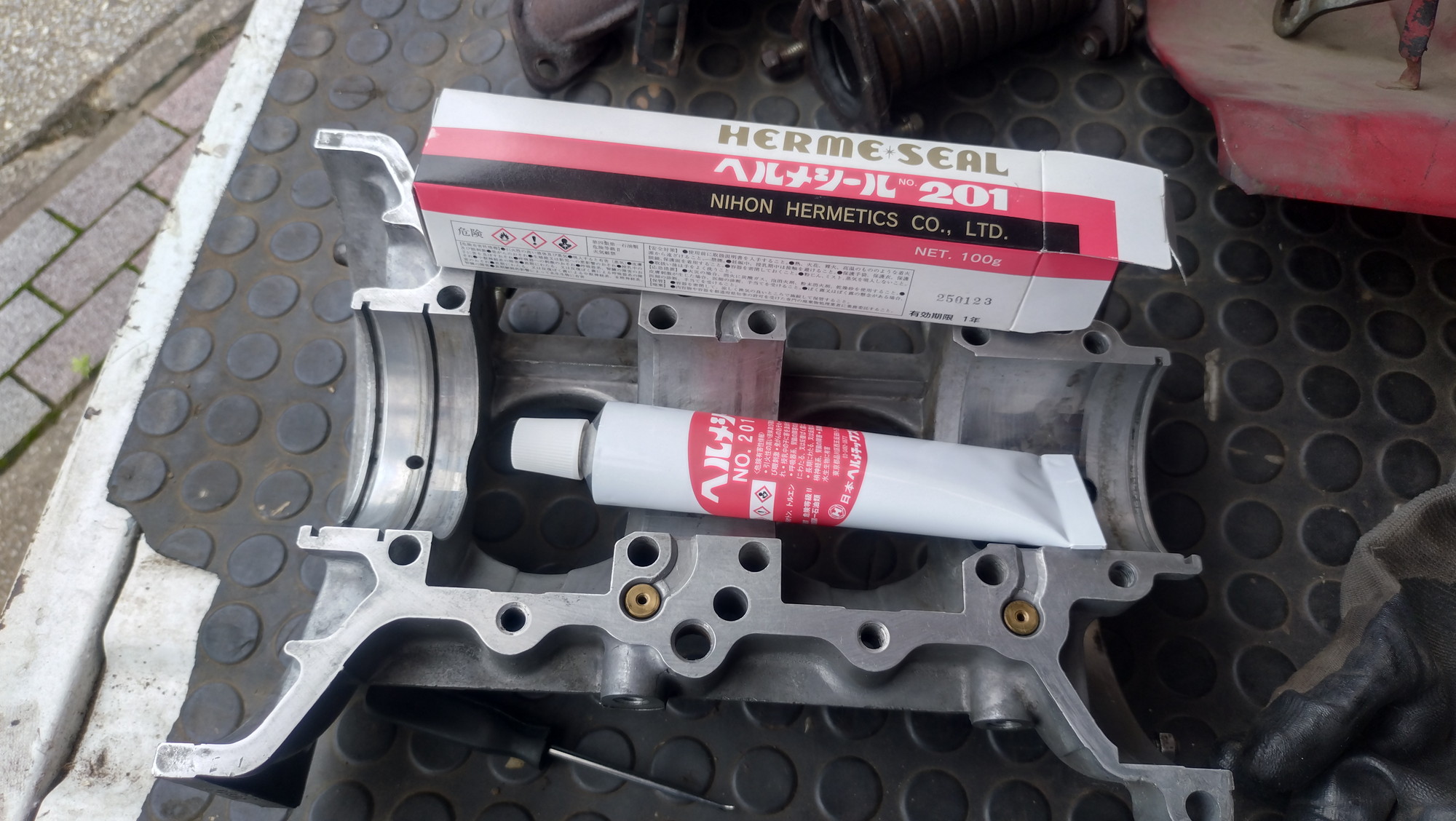 当時からの三菱自動車純正指定品の液体ガスケット。他のものでも良いのでしょうけど、ずっとこれを使っていまして。ただ、相当量あるので使いきれないし、他に使うところがあるわけでもないので、もったいないなあ。。