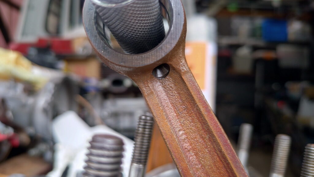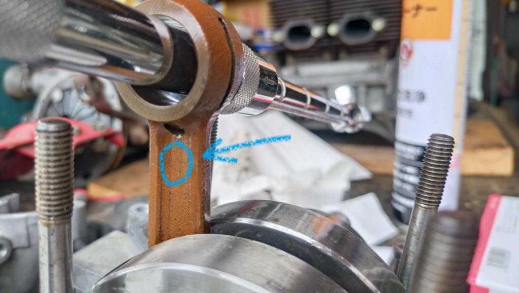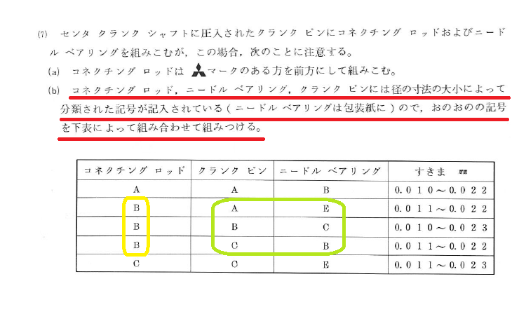 コンロッドにある外径選別符号。この符号に対応するピンとニードルベアリングが決められています。このコンロッドは「B」なので下記から対応するピンとベアリングを探します・・・