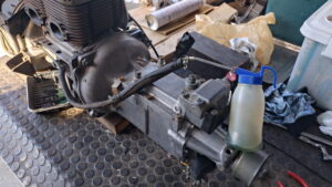 トランスミッションオイルはナナメにすると後端から漏れてくるのでこの状態で注ぎます。←エンジンを載せるとオイルの注入が至極やりづらいため。