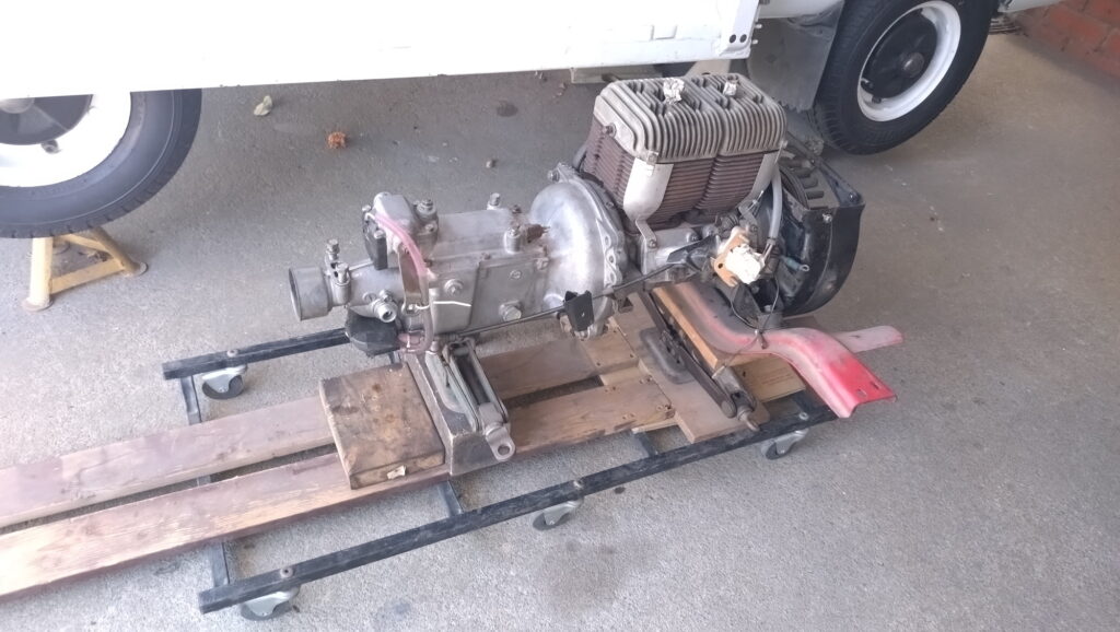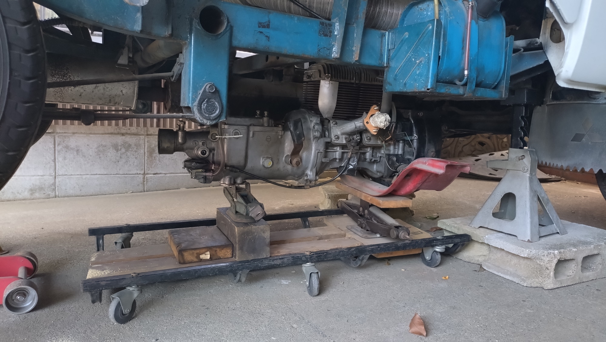 うっかり荷台でエンジン+トランスミッションを組んでしまい、これを下ろさないといけない・・・下せるのかどうか。