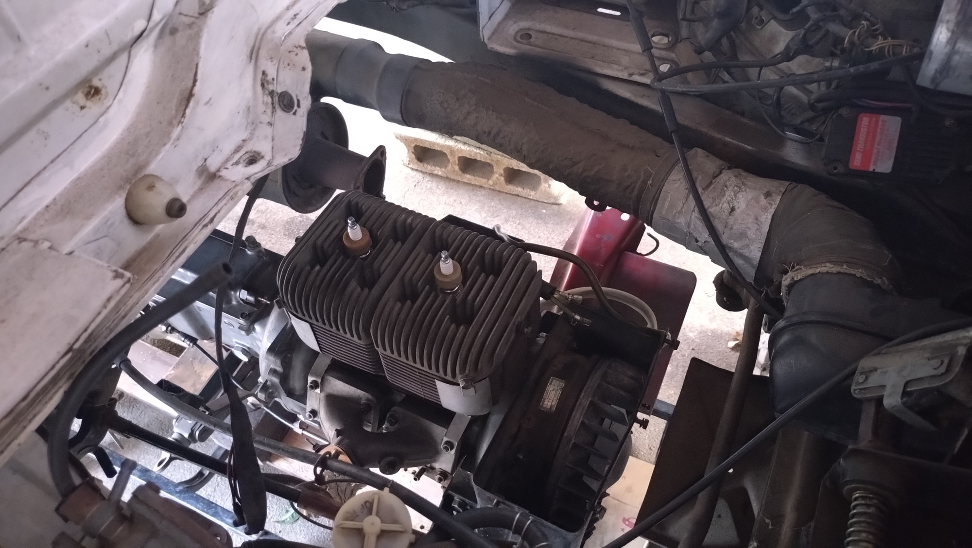 画像をよく見てください。エンジンをブロックと木材に載せて高さをホールドさせておき、赤のメンバーを取り外した状態がこれです。このあと取り付けブロックの左右反転化には成功しましたが、終始エンジンはかなり不安定な状態でこちらのほうがリスクが高かったので反省です。