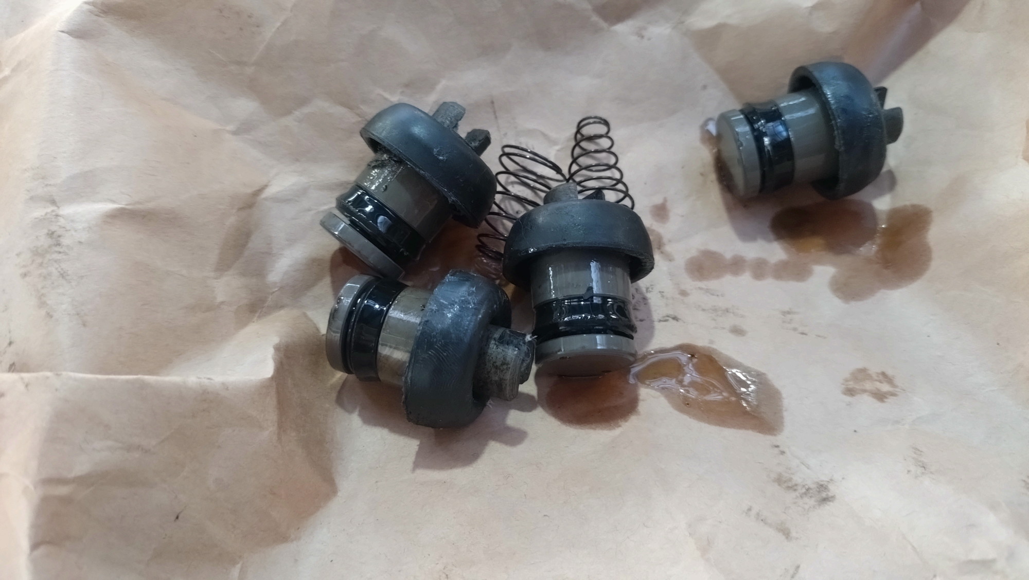 調理後のピストンと新品カップ。付属のグリスをたっーぷりと塗布してカップの向きに注意しながら組付けます。カップはめちゃくちゃ固い上にグリスで手元が滑るので根気よく行う必要があります。イライラしているときにやらない作業の1つですね。