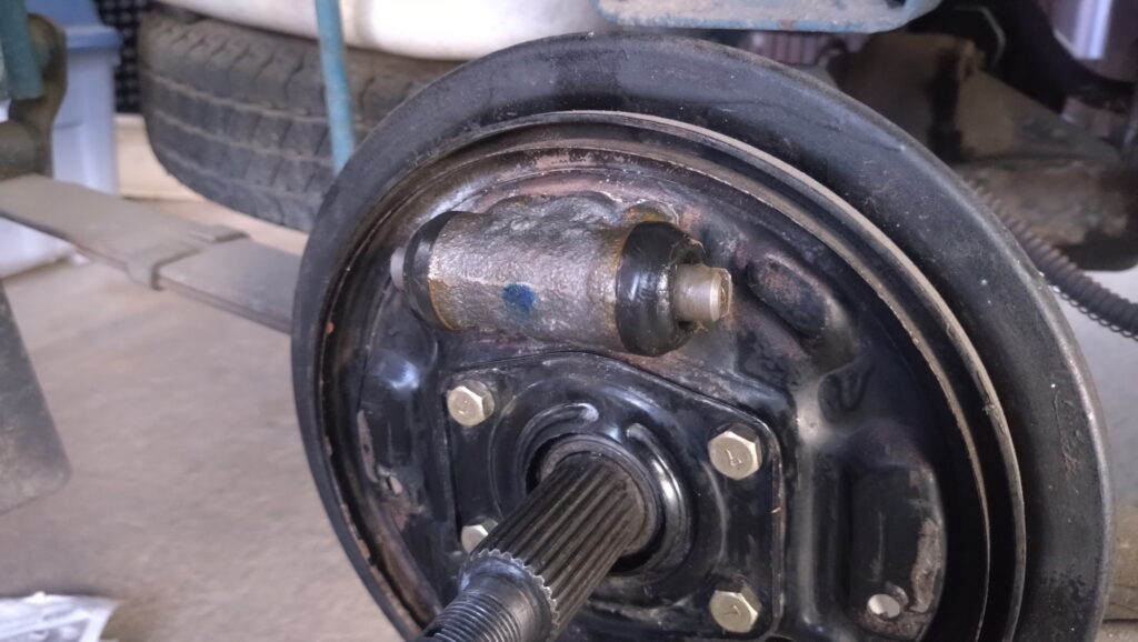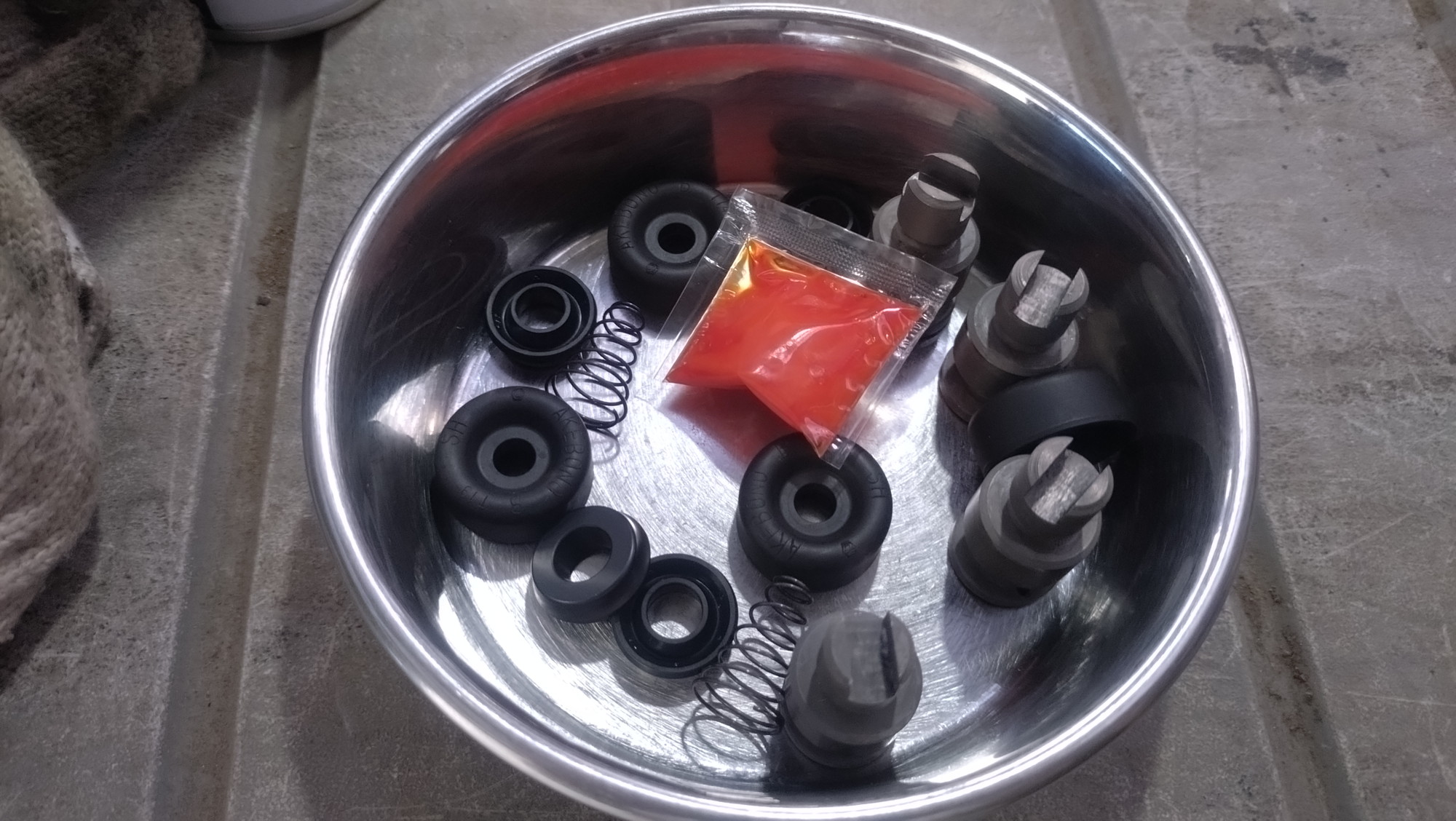 そうそう、このピストンはバネが入っているんですよね。8年前に純正新品に交換していますがパーツカタログにバネの設定なし。ただ、このリアのホイルシリンダはミラージュなど他車種にやや広めに共通化されているので、もしかしたらそちらで設定があるのかもしれません。にしてもなぜ円錐状のバネなのかは不明。