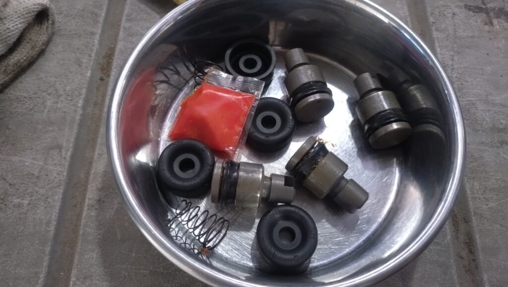 いつものメニューですが、今年は☆印の特別オプションメニューを追加。前回のカップ交換を調べたら2018年・・・8年前のことです。漏れや不具合は無いものの、ホイルシリンダをサビさせてしまっては”終わる”ので予防交換として実施です。