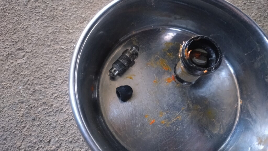 ピストンの取り外し。カップやブーツはフニャフニャになっておらずヘタってもないのでまだ使用できそう~